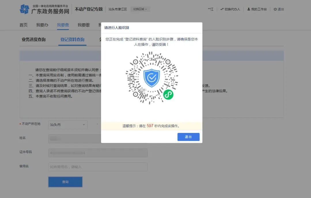 4. 点击“查询”按钮,此时会再次弹出二维码,请使用微信“扫一扫”进行第二次人脸识别认证(粤信签),按步骤完成。
