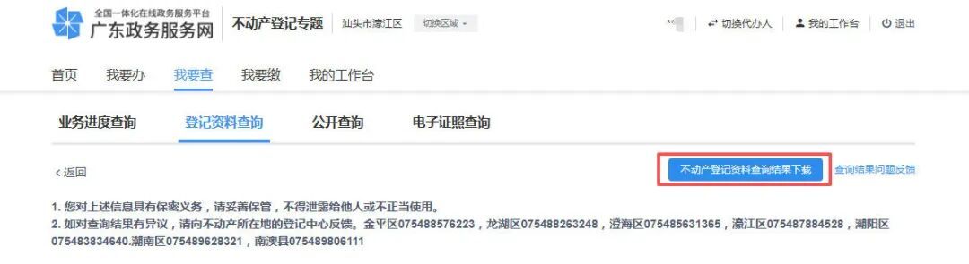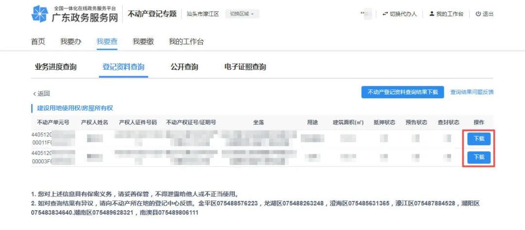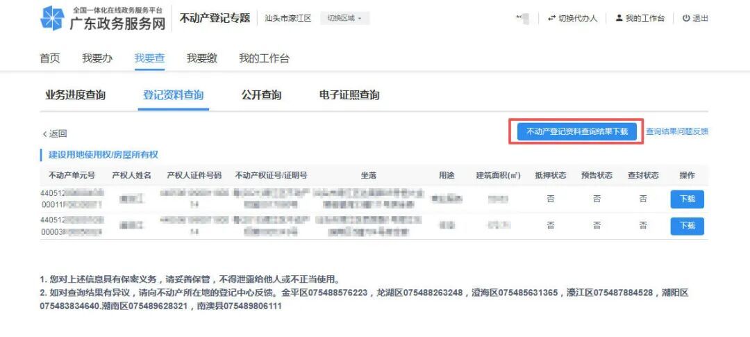 情况二:名下有不动产。页面会列出申请人名下的不动产登记信息。点击“不动产登记资料查询结果下载”按钮,系统会生成《不动产登记资料查询结果》,可保存文件或直接打印。