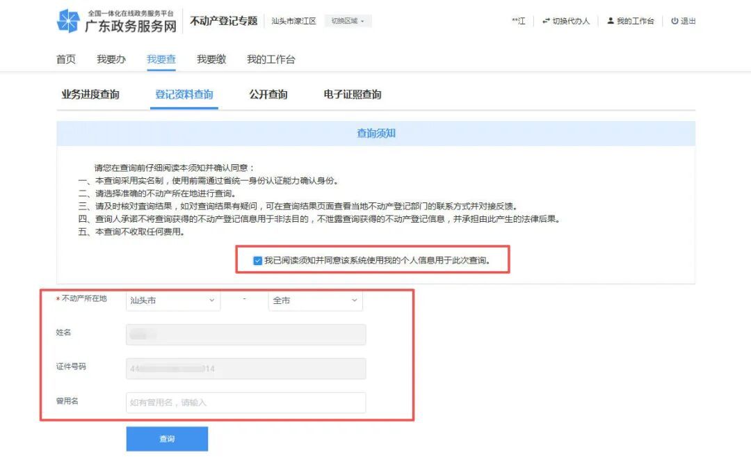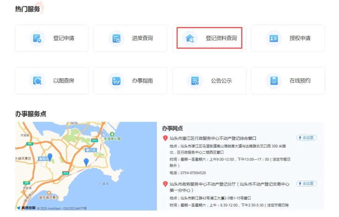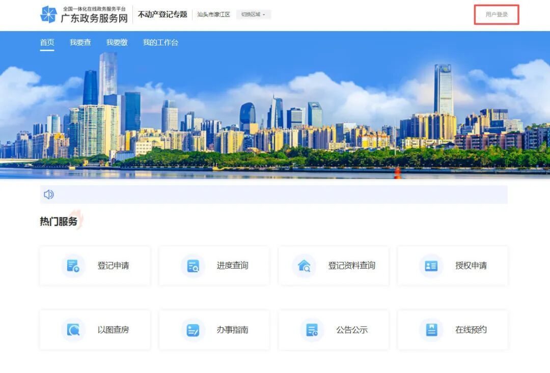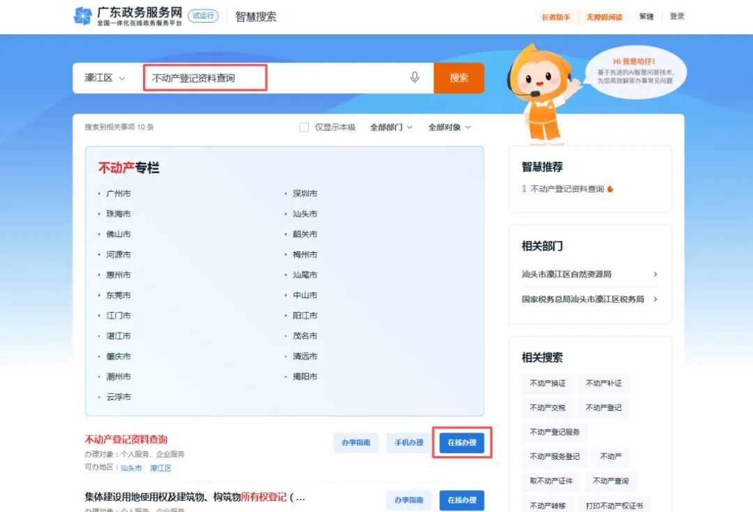 1. 市民通过互联网搜索打开广东政务服务网,选择汕头市濠江区分厅(https://www.gdzwfw.gov.cn/?region=440512),在事项搜索框搜索“不动产登记资料查询”,点击“在线办理”进入不动产登记平台。